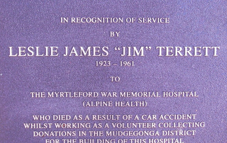 It is a memorial to the sacrifice of a volunteer (Leslie James ‘Jim’ Terrett) who died in 1961 aged only 37, following a car accident at Mudgegonga while going from house to house seeking pledges for donations for this hospital on a very cold winter’s nig...