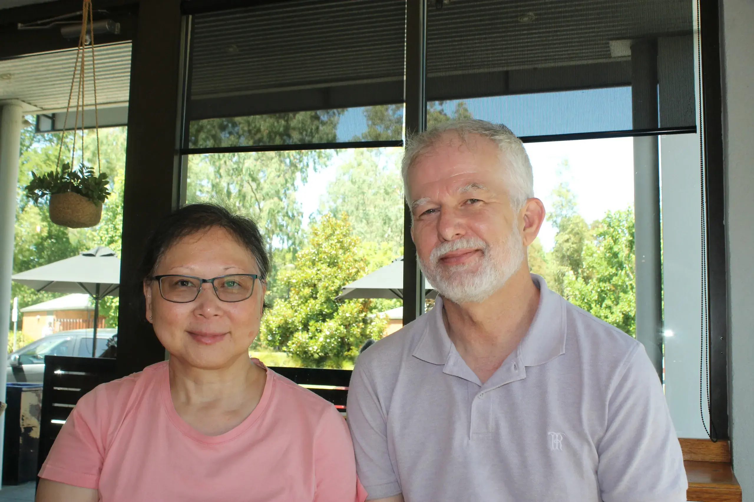 P: Here in the country, you're out of the hustle and bustle of city life. We like the way the town is nestled in the mountains. We love the roses here: where we live, they grow with mildew on them, but here they grow very well.
